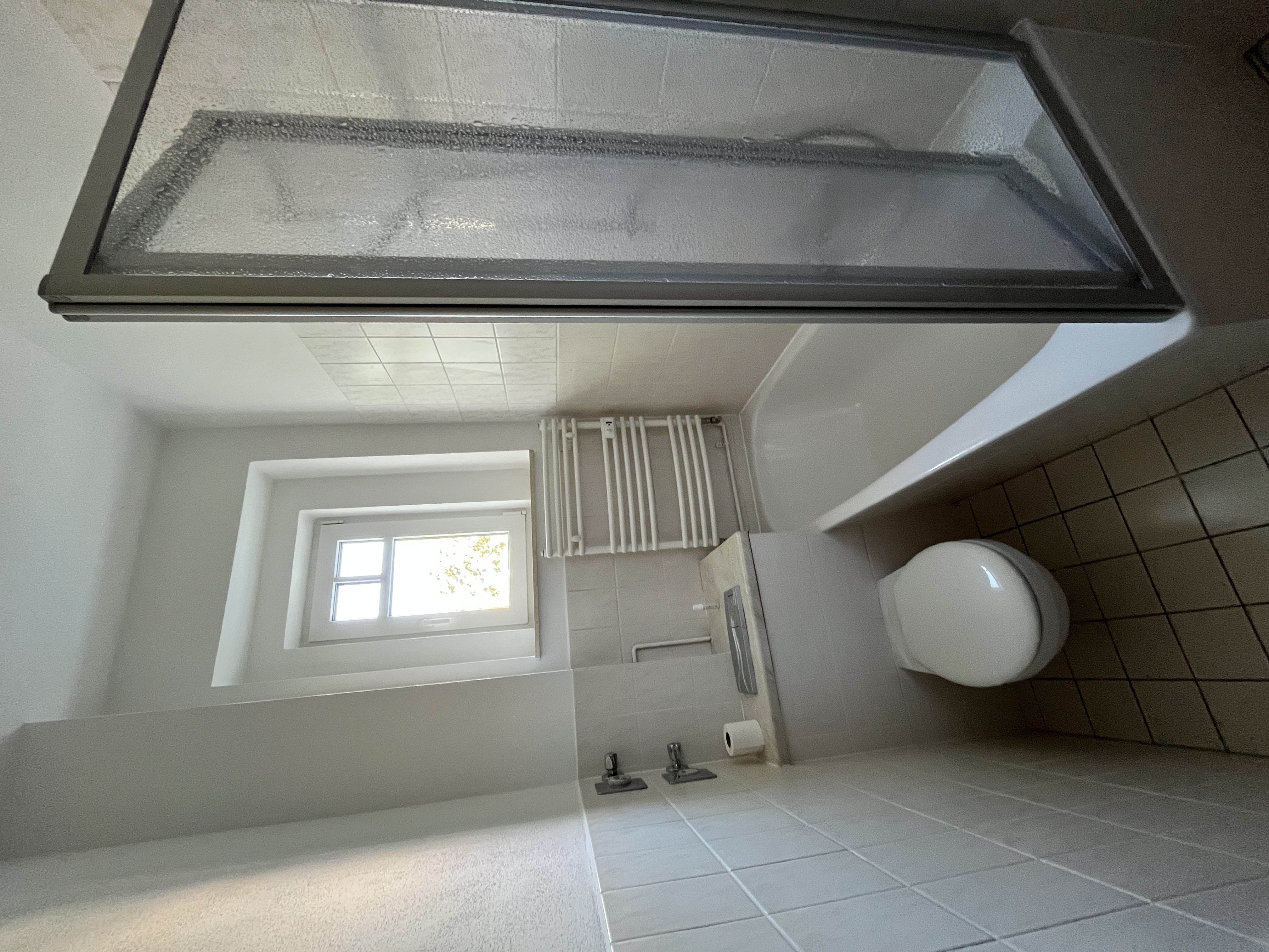 - gefliestes Bad mit Badewanne und Duschabtrennung, Handwaschbecken, Handtuchheizkörper und Fenster